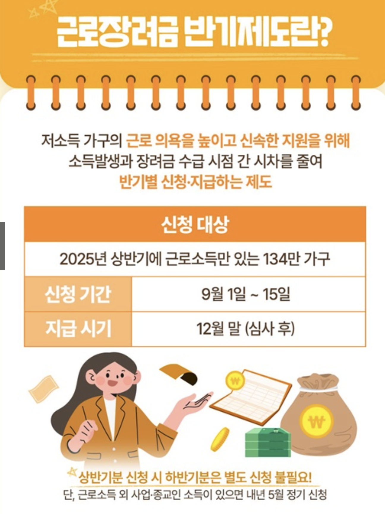 반기제도는 이러한 시차를 줄이기 위해 마련되었습니다. 상반기 소득분에 대해서는 9월에 신청해 12월 말쯤 지급을 받고, 하반기 소득분은 다음 해 3월에 신청해 6월쯤 지급받을 수 있습니다. 따라서 연간 단 한 번 기다리는 것보다 훨씬 빠르게 지원을 받을 수 있다는 장점이 있습니다.