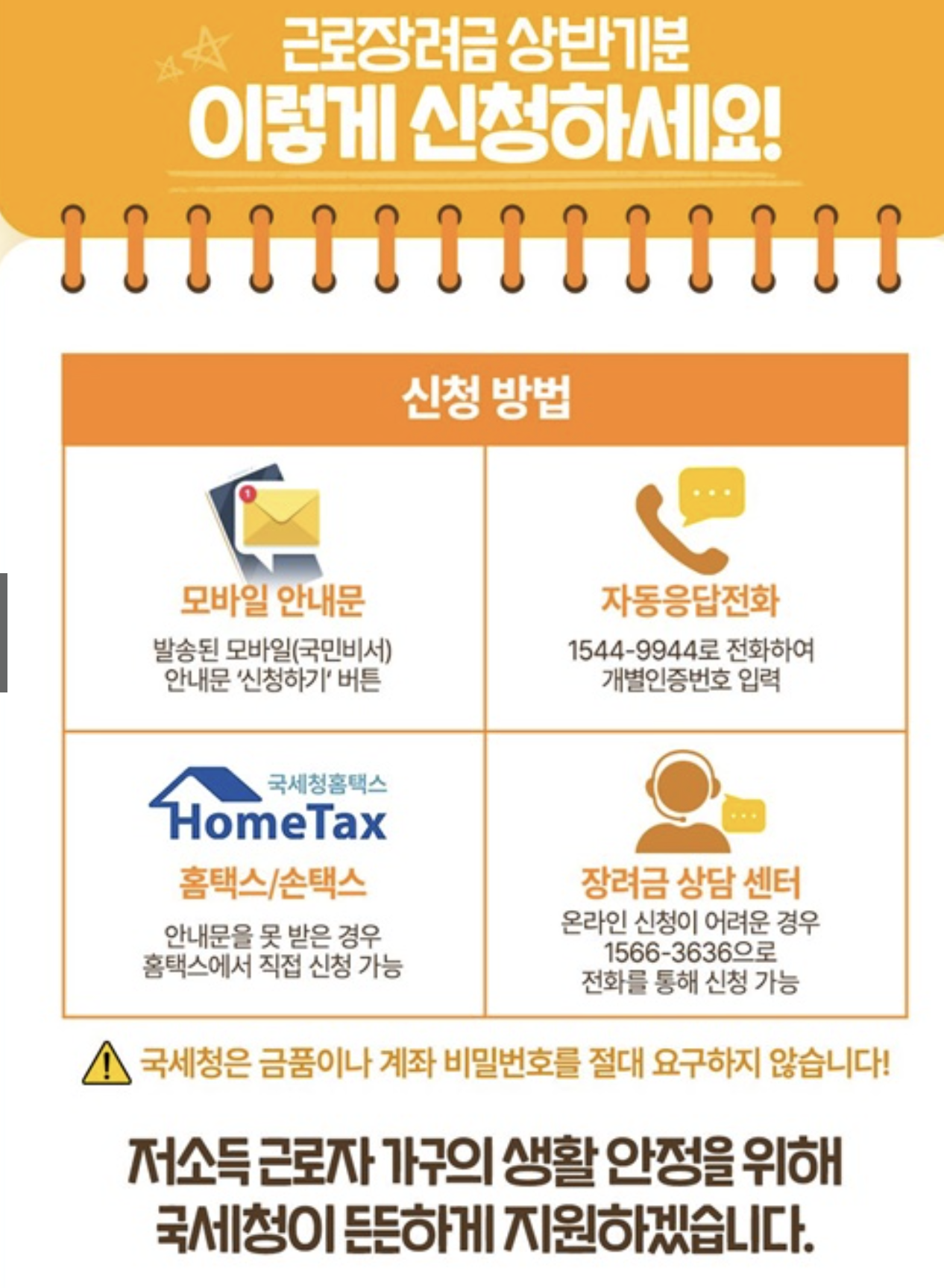 근로장려금은 정부에서 직접 지급하는 제도이므로 국세청은 어떠한 경우에도 금품이나 계좌 비밀번호를 요구하지 않습니다. 최근에는 이를 악용한 피싱이나 사기 사례가 많아 주의가 필요합니다. 반드시 국세청 공식 채널을 통해서만 신청해야 하며, 문자 메시지나 카카오톡으로 온 링크를 함부로 클릭하지 않는 것이 안전합니다.