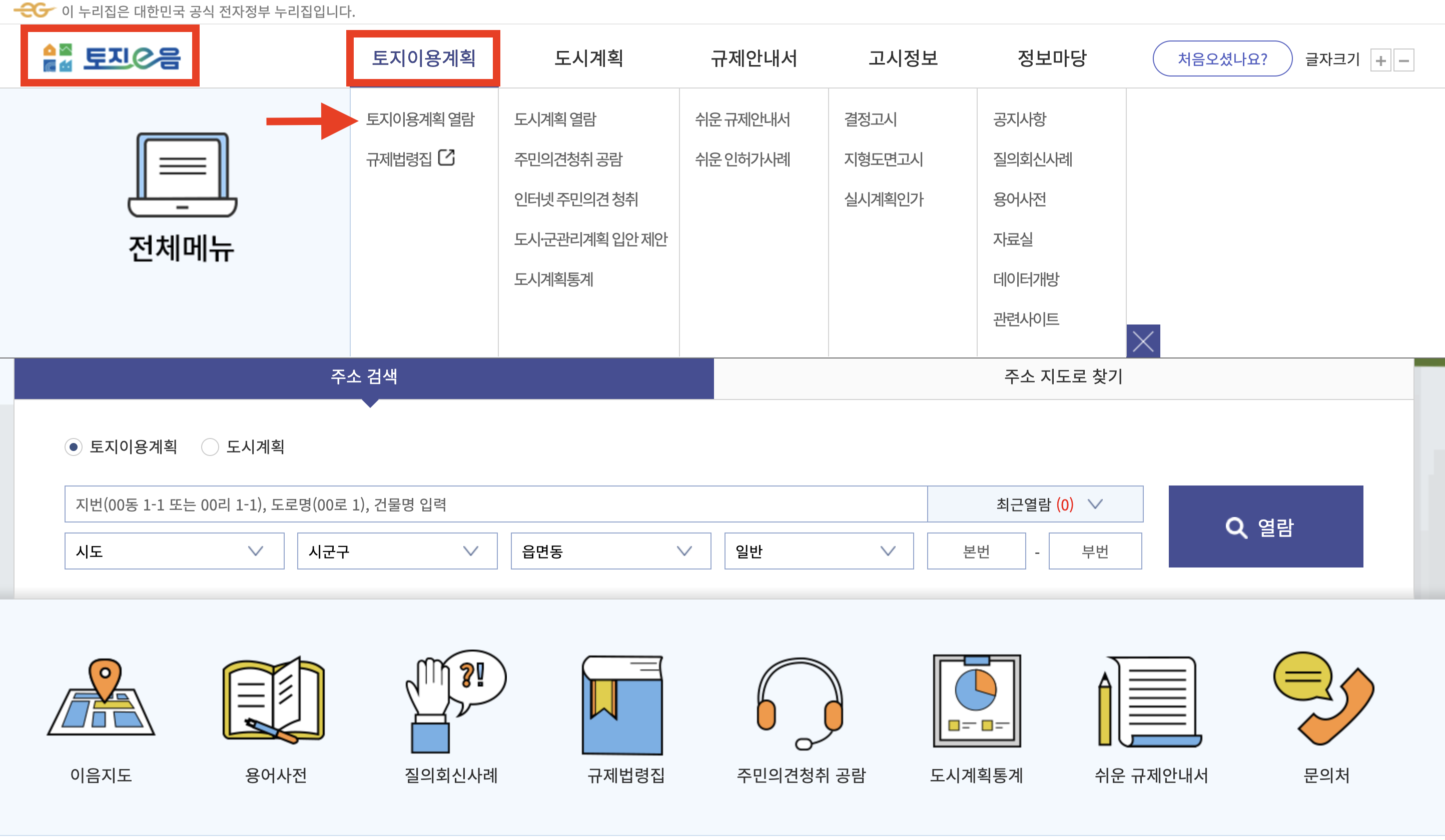 * 상단 메뉴에서 ‘토지이용계획 열람’ 클릭