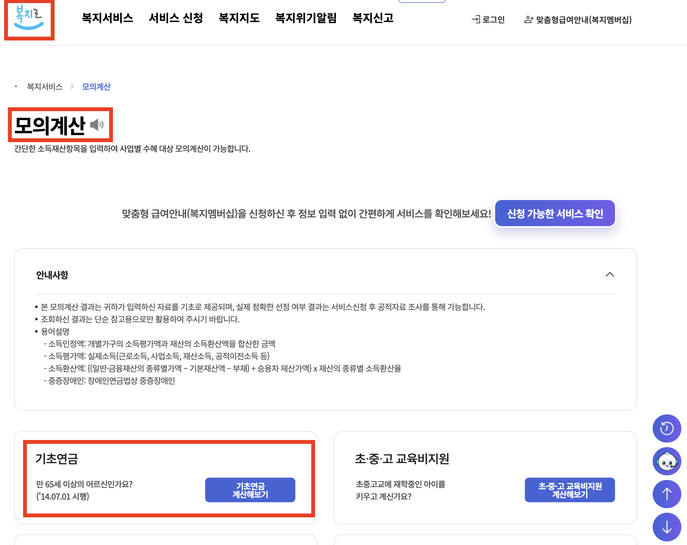 * 메인 화면 상단 메뉴에서 [복지서비스] → [모의계산] → [기초연금]을 선택합니다.