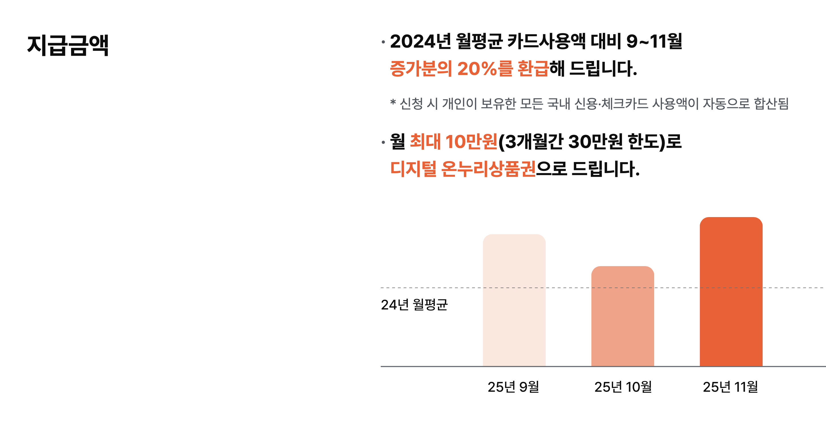 기준 비교 기간은 2024년 월평균 카드 사용액이며 2025년 9월~11월이 실적 인정 기간입니다. 증가분의 20%를 디지털 온누리상품권으로 환급해주며 지급일로부터 최대 5년동안 사용할 수 있습니다.